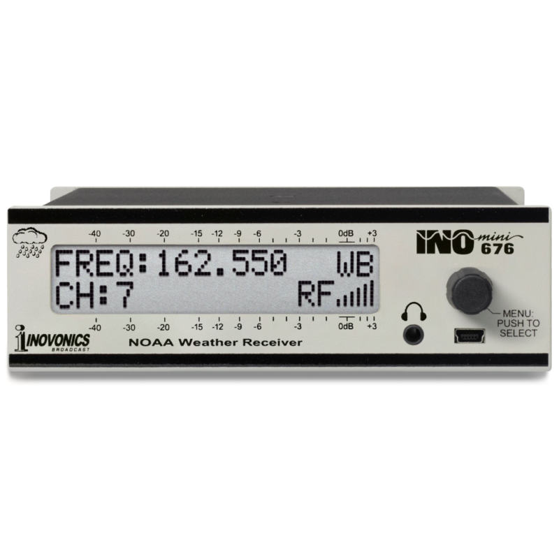 The INOmini 676 is Inovonics’ second-generation, small form-factor off-air radio receiver for reception of NOAA weather information and alerts. It tunes all US and Canadian weather band frequencies and responds to the 1050Hz Warning Alarm Tone (WAT). The receiver gives front-panel and remote alarm indications for WAT, Low Signal and Audio Loss conditions and delivers both analog and AES digital audio outputs with adjustable levels. Features A sensitive, DSP-based (SDR) receiver for the 162.400 to 162.550 North American weather band. Flashing-red front-panel alarms and rear-panel ‘tallies’ for WAT (1050Hz tone), Low Signal and Audio Loss. Balanced analog and AES-digital program line outputs are available simultaneously and may be used for re-transmission. Levels are independently adjustable. All receiver setup parameters are held in non-volatile memory. When issued, free firmware updates are easily installed in the field. Specifications Tuning Range 162.400MHz – 162.550MHz in 25kHz steps; AFC follows transmitter frequency errors. Antenna Input 75-ohm F connector Sensitivity/SNR 10dBμV for 40dB S/N; selecting the Mute option will silence the audio outputs with a Low Signal condition. Reception Mode Narrowband FM (NBFM) Audio Bandwidth –3dB, 300Hz – 3kHz with automatic dynamic bandwidth filter for poor reception conditions. Response is further tailored to optimize speech intelligibility. Speech Audio Outputs Balanced Analog (XLR) Left and Right (dual mono) outputs are adjustable from –15dBu to +15dBu in 0.2dB steps. AES Digital (XLR) output at 44.1kHz is adjustable from –30dBFS to 0dBFS in 0.2dB steps. Headphone Jack (3.5mm TRS) has adjustable listening level. Front-Panel Red-Flashing Alarms Alert Tone: The 676 responds automatically to the 1050Hz WAT tone. Low Signal: Alarm and reset trigger levels are independently adjustable relative to the RF signal level display. Audio Loss: Alarm threshold is adjustable between 0dB and –40dB, and the alarm delay interval is adjustable between OFF and 120 seconds. Alarm “Tallies”: Individual open-collector NPN transistor outputs to ground are programmable for logic polarity. USB Port The front-panel mini-USB port allows the quick uploading of firmware updates when issued. Power Requirement 12VDC at 350mA; a universal 90 – 240 VAC inline switching power supply is included with the INOmini 676 receiver. Mounting Options An optional rack adapter accepts up to three INOmini modules in a 1U, 19-inch rack space. The 676 also may easily be fastened to any convenient surface with two small screws. Size and Weight 1.6”H x 5.5”W x 5.5”D; 4 lbs. shipping weight Direct Buy:- https://www.inovonicsbroadcast.com/product/676