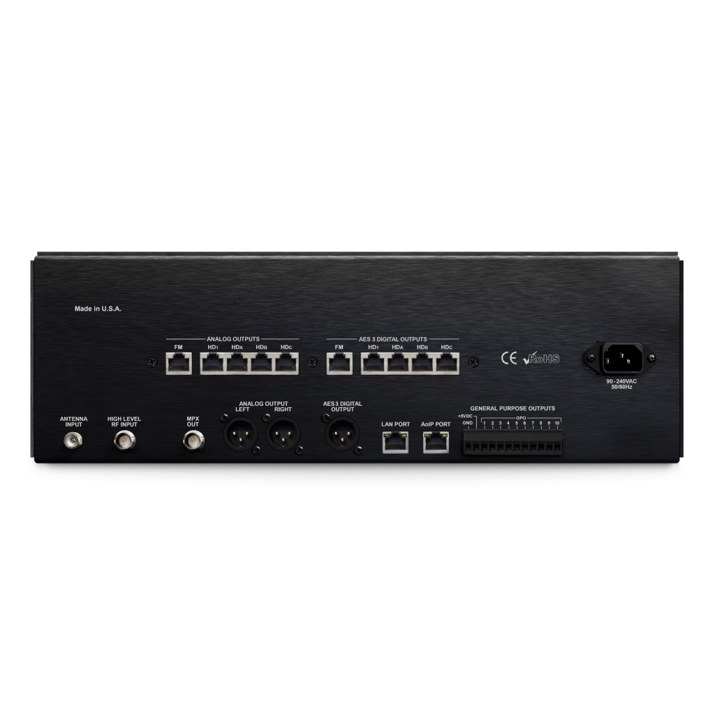 - Fulltime off-air program audio is available simultaneously as L/R-analog, AES3-digital and Dante®-based AES67 AoIP streaming, all with adjustable levels, plus a multi-listener Internet IP stream and front-panel headphone jack.